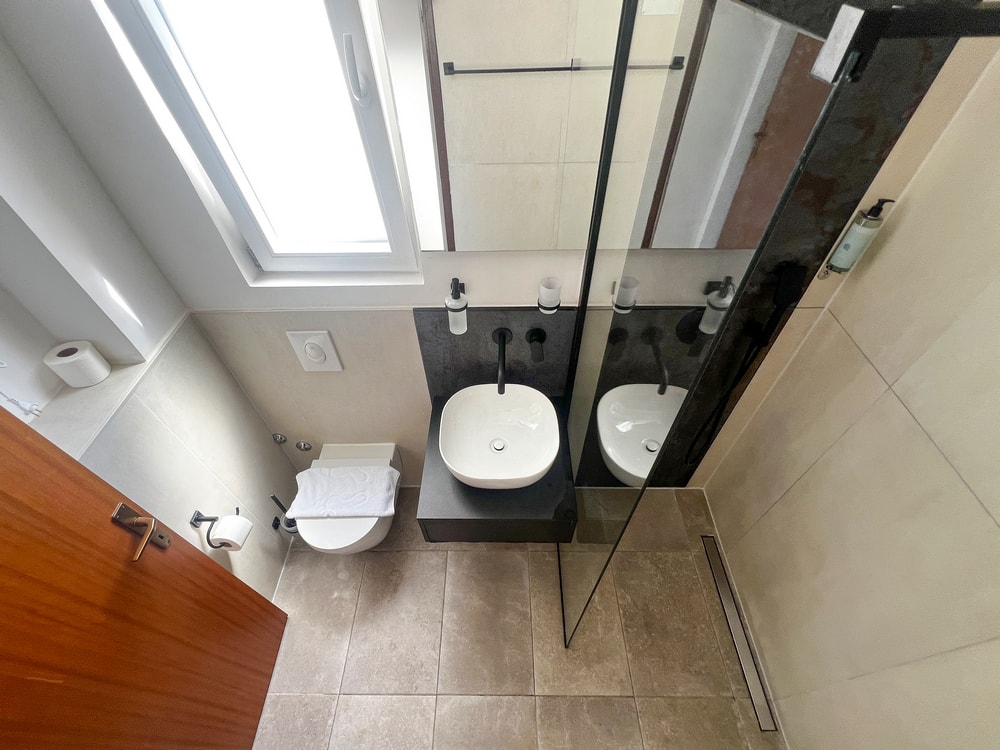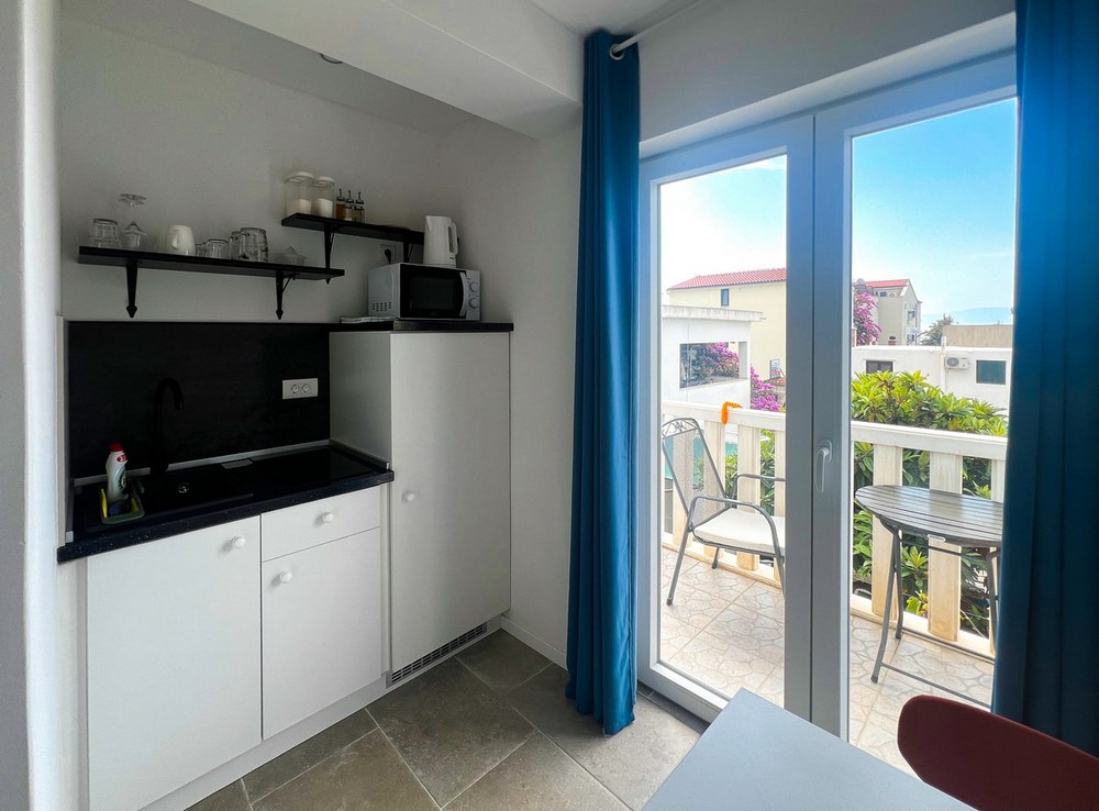Air-conditioned two-bed apartment for 2 adults or 2 adults and 1 small child up to 6 years old, with a view to the south side. The apartment is equipped with a double bed and an extra bed for a child up to 6 years old. The size of the apartment is 20 m2, and it consists of a double room with a balcony, a kitchen with a balcony and a bathroom with a shower. The apartment has a fully equipped kitchen, bed linen, blankets, bath towels, hair dryer. The room contains a wardrobe with drawers, bed linen is prepared on the bed. In the case of an extra bed, bed linen and blankets will be provided for the sofa bed on request with additional charge.